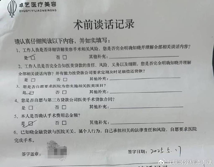 武汉卓艺与其合作金融机构在明知贷款主体人不符的情况下,为其发放医美贷款,那么这份术前谈话记录,该签表妹的名字还是王女士的名字呢?很明显,无论签两人谁的名字,均存在合规疏漏,如果其他消费者遇到同等情况,应去银监会投诉维权。