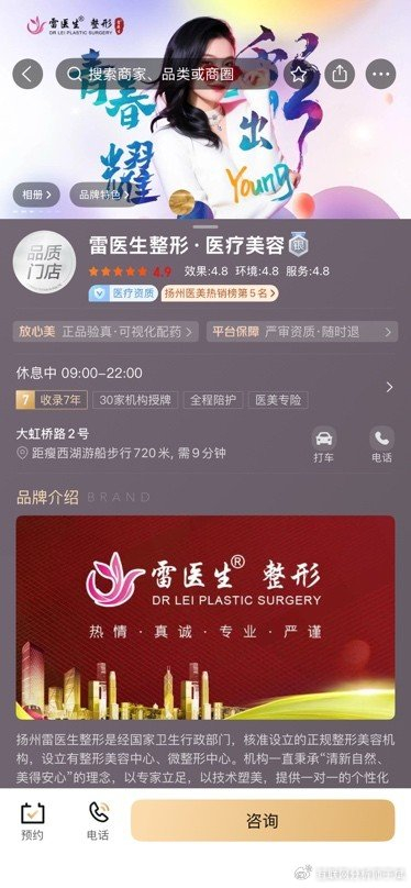 而除了一些头部连锁医美机构在扬州地区的分支机构之外,有一家名为扬州雷医生整形的医美机构引起了我们的注意。