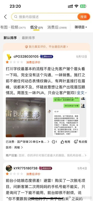 “打川字纹最基本的流程不是让先客户皱个眉头看一下吗,完全没有这个沟通,一味销售。施打之前不做任何动态表情纹确认,有两针直接打在眉峰,说都来不及,怀疑故意想让客户出现眉压眼情况。周医生一味PUA,只会让客户割双眼皮眼袋抽脂,说客户不做保养,这个年纪不长斑真是幸运。就是说能不能正经把该做的项目做好,一点流程管理都没有,差评!”