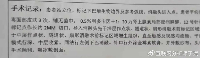 手术当天,医生为丁女士采用的是局部麻醉,主治医生使用一款等离子射频仪器,将类似钢针的物体从下巴外缘插入,来回搅动进行消融。