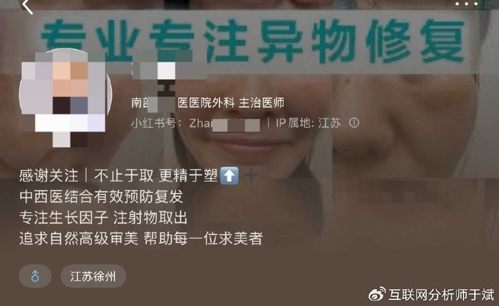 除此之外,该机构还发布了大量下巴生长因子取出案例来证明机构的专业性。小红书上的医生张某,是持有徐州予美医疗美容50%股份的大股东,张某发布多条患者术前术后对比,多数是与生长因子取出相关。