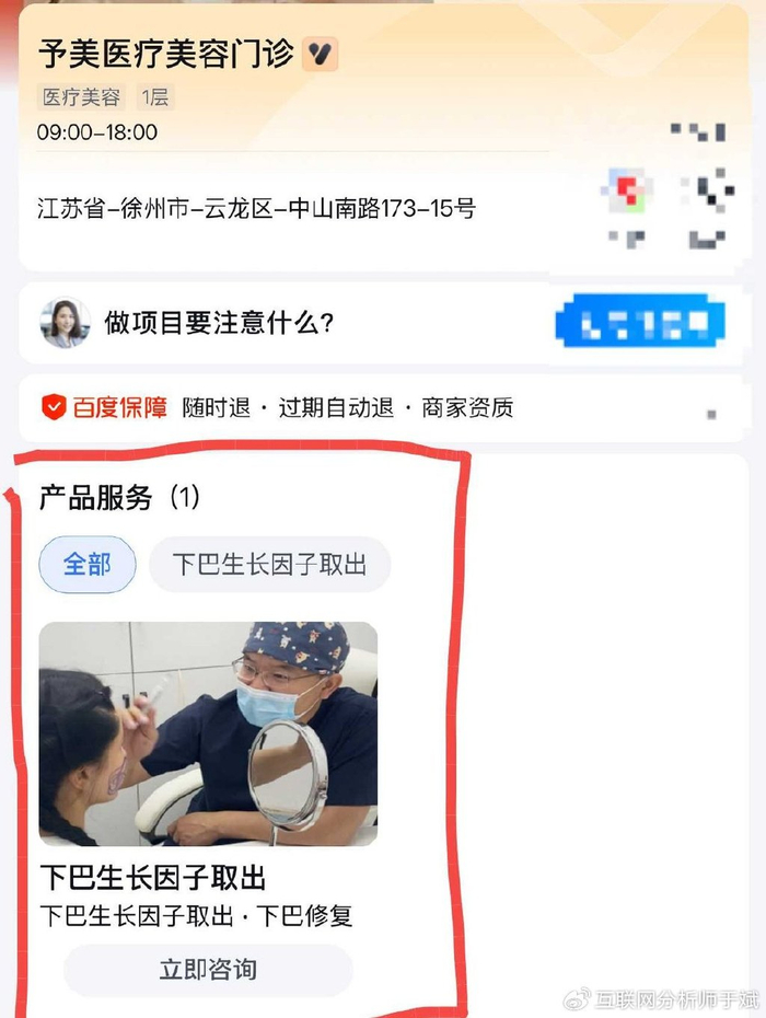该事件报道后,深度美业通过百度地图查询,徐州予美医疗美容门诊在百度地图开通了VIP,并显示该项“下巴生长因子取出”服务。