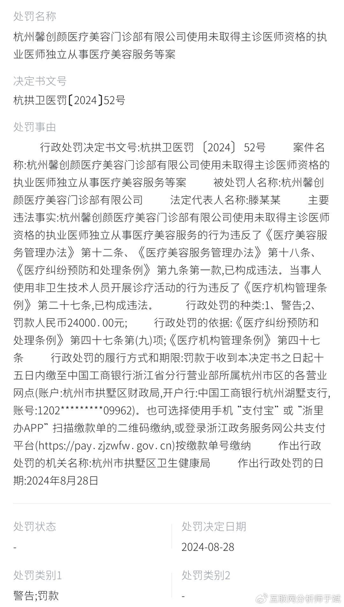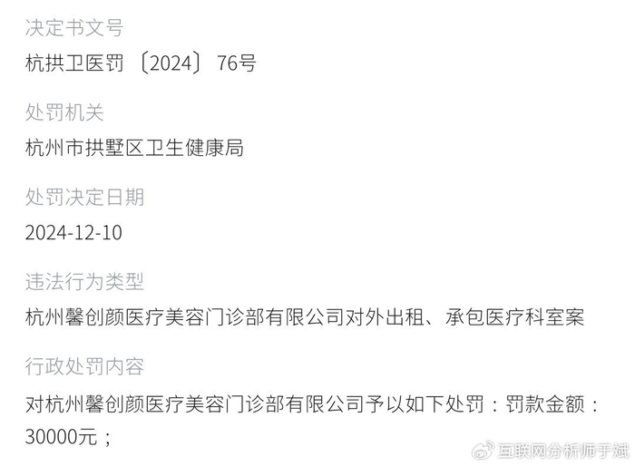 天眼查,2024年12月10日,杭州市拱墅区卫健局认定杭州馨创颜医疗美容门诊部有限公司违规将医疗科室出租给个人,违反《基本医疗卫生与健康促进法》,对其处以罚款3万元的行政处罚。