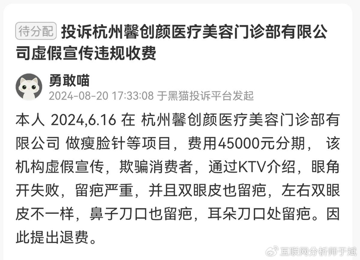2024年8月20日,另一位消费者在黑猫投诉平台发起此次投诉,称其于2024年6月16日在杭州馨创颜医疗美容做瘦脸针等项目,以分期形式支付了45000元。