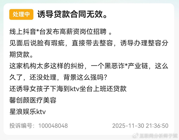 该消费者表示,该机构此类纠纷很多,是一个诈骗产业,还诱导女性在KTV上班,以偿还贷款。该消费者在投诉最后提到了相关KTV名称为星浪娱乐KTV。截至深度美业发稿前,该投诉尚在处理中。
