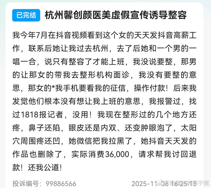 2025年11月18日,有消费者于黑猫投诉平台发起投诉。该消费者称,其于2025年7月13日,在抖音平台被一名用户“思思在努力”(后改名“念念向前看”)以提供高薪工作为由诱骗至杭州馨创颜医疗美容医院。到店后,她与一名男性同伙相互配合,以“不整容无法入职”为由对该消费者进行洗脑,且在该消费者明确表示无意整容后,强行夺过手机操作征信查询及贷款支付。最终,在诱导和欺骗下,该消费者支付了总计38380元的整容费用。该消费者要求医院承担相应的赔偿责任。截至深度美业发稿前,该投诉未能及时联系到该机构,尚在处理中。