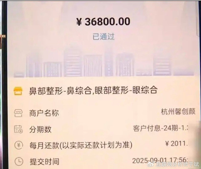 据《1818黄金眼》栏目调查,蔡女士于8月底通过网友介绍得知杭州某岗位薪酬优厚:“新人月薪可达3-4万元,资深员工收入4-6万元且包食宿”。面试过程中,自称阿康的中介以形象不符影响薪资为由,将其带至杭州拱墅区馨创颜医疗美容机构。在医院内,阿康以便于办理入职手续为名,操作蔡女士手机完成36800元美容贷款申请,分24期偿还总额达48000余元。手术项目包含鼻综合、眼综合等,但术后承诺的工作机会却不了了之。