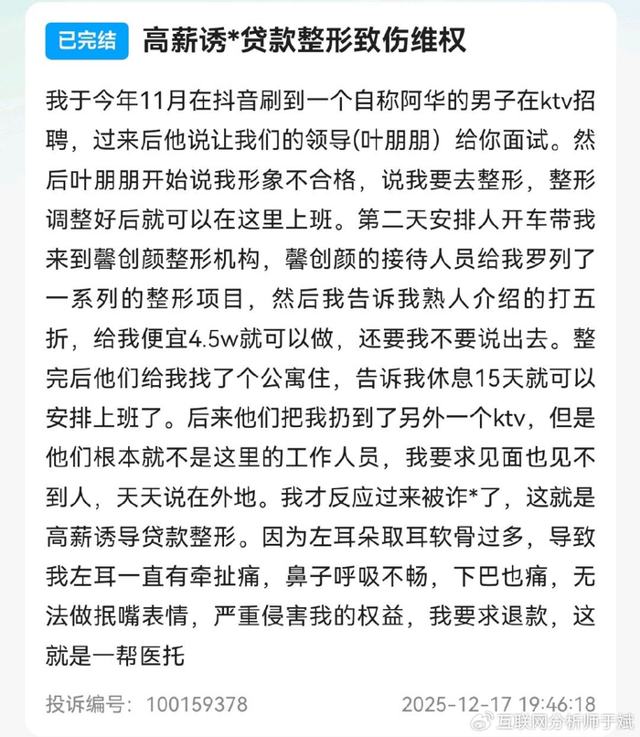 2025年11月30日,有消费者投诉称该机构通过线上抖音平台发布高薪岗位招聘,见面后称其脸部有瑕疵,随即被带去杭州馨创颜整容,期间被诱导办理分期贷款。