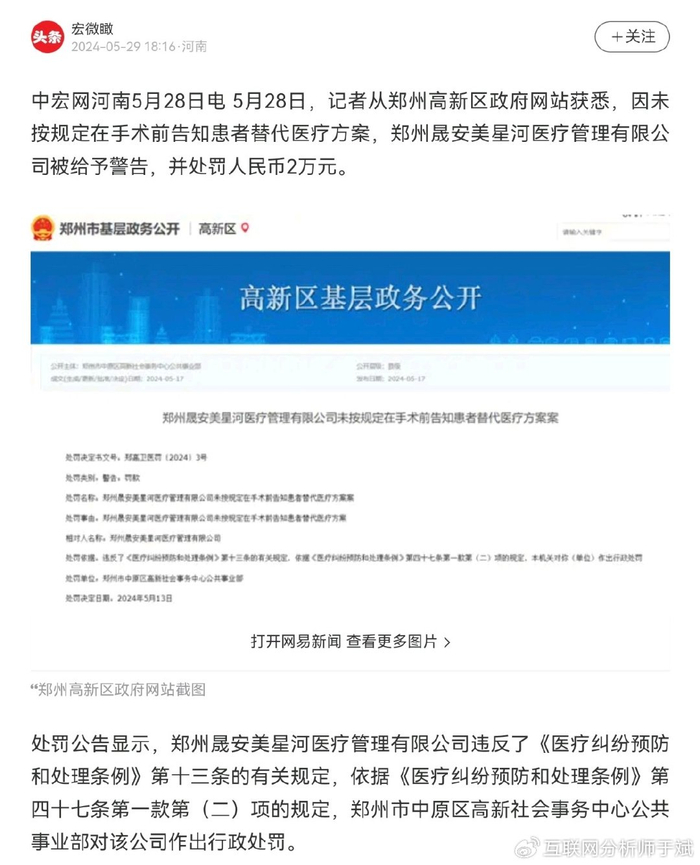 天眼查显示的相关信息与上述案例中消费者所描述该机构的更名换壳情况是相符的。此外,消费者所提郑州晟安美星河未在术前告知替代医疗方案而被行政处罚的记录,同样有据可查。