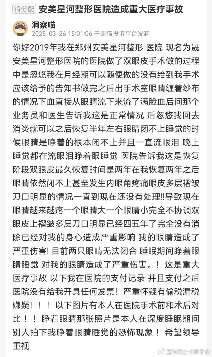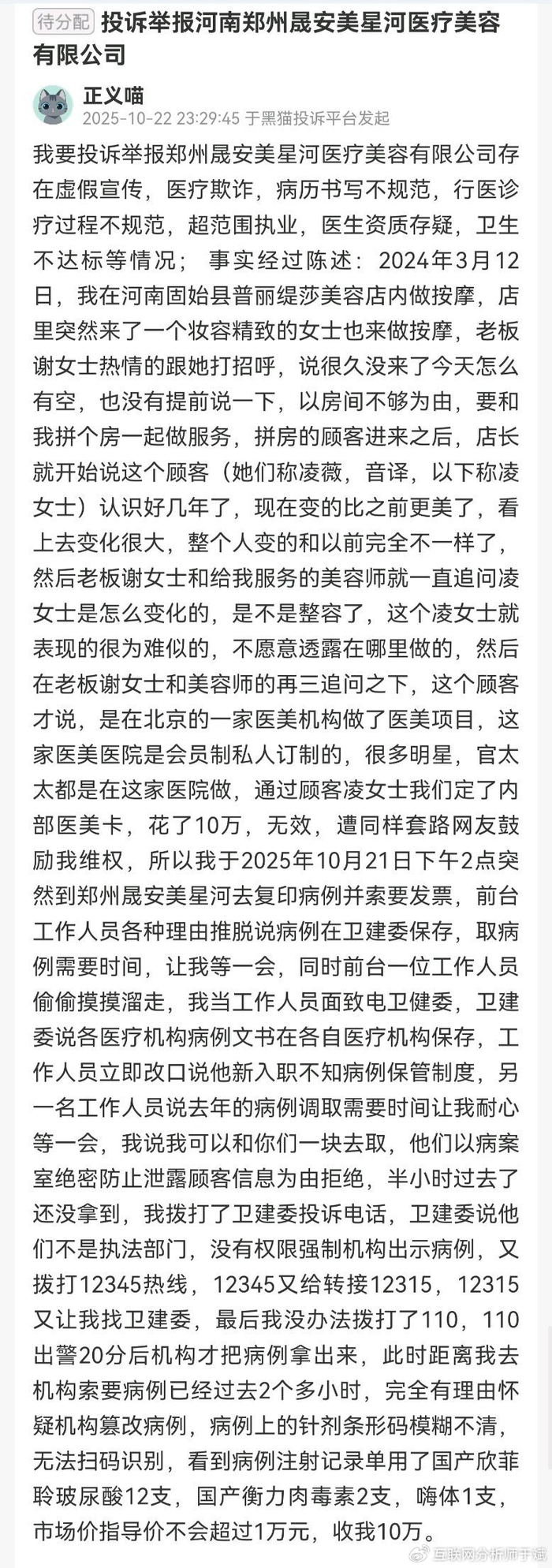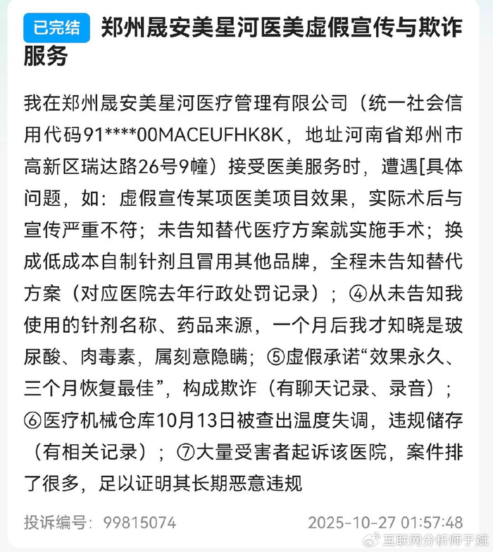 该消费者于2025年10月22日,在黑猫投诉平台发长文举报河南郑州晟安美星河医疗美容有限公司,指出该机构存在虚假宣传、医疗欺诈、病历书写不规范、行医诊疗过程不规范、超范围执业、医生资质存疑、卫生不达标等情况。
