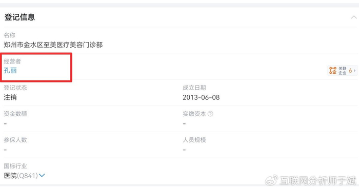 天眼查数据显示,成立于2013年的郑州市金水区至美医疗美容门诊部,经营者为孔丽,目前已注销。