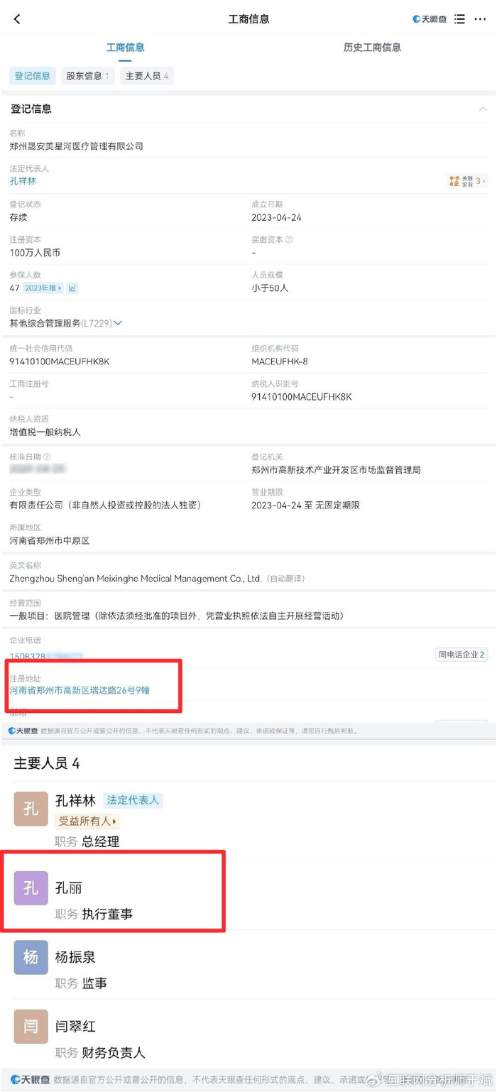 再到2023年成立的郑州晟安美星河医疗管理有限公司,该机构执行董事同样是孔丽。