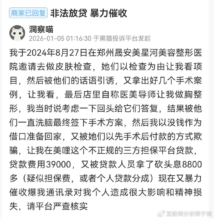 该消费者进一步指出,其随后以没钱为由准备离开,却又被该机构以“先手术后付款”的方式诱导,最终在第三方担保平台“美哩”办理了贷款,金额为39000元。在此过程中,贷款方还收取了高达8800余元的“砍头息”。此后,该消费者遭遇了暴力催收,包括通讯录被曝,对其个人生活与精神造成了严重困扰和损失。为此,她希望投诉平台能严查并核实此事。截至深度美业发稿前,黑猫投诉平台显示,商家已对此投诉作出回复,案件仍在处理之中。