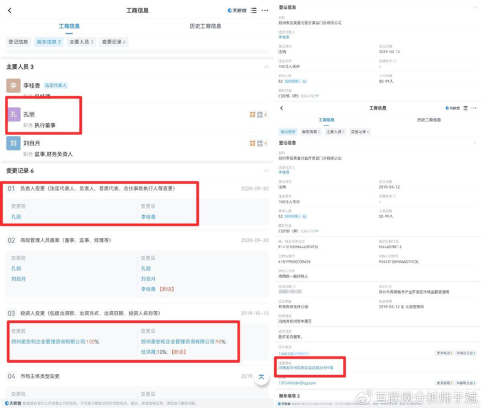 成立于2019年的郑州市安美星河医疗美容门诊有限公司,最早的法人同样是孔丽,其于2020年将法人变更为李桂香,孔丽担任执行董事职位。该机构于2023年注销。