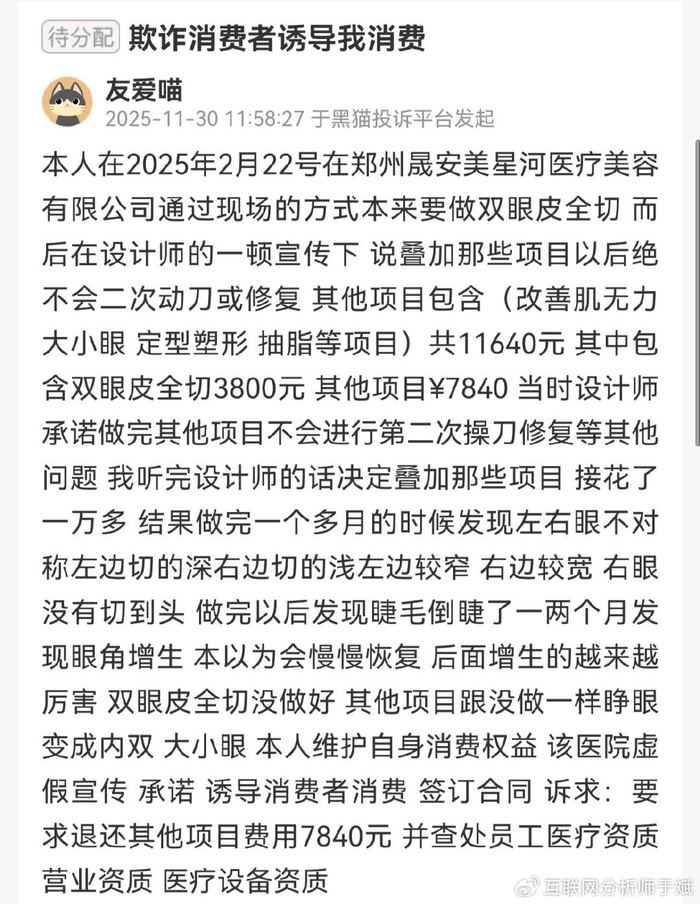 2025年11月30日,一位消费者投诉称。其原计划于2025年2月22日在郑州晟安美星河美容整形医院进行双眼皮全切手术。该院设计师当时推荐其叠加改善肌无力、矫正大小眼、定型塑形及抽脂等项目,并承诺做完这些后绝不需要二次手术或修复。这些项目总费用为11640元,其中双眼皮全切为3800元,其余项目共计7840元。该消费者听信承诺后,决定接受叠加项目并支付了全部费用。