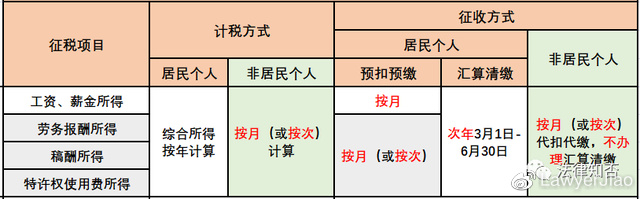 “居民个人”取得征税项目①~④项所得(以下称综合所得),按纳税年度合并计算个人所得税有扣缴义务人的,由扣缴义务人按月或者按次“预扣预缴”税款;需要办理“汇算清缴”的,应当在取得所得的次年3月1日至6月30日内办理“汇算清缴”。