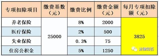 每月专项扣除额=25000*(8%+2%+0.3%+5%)=3825元