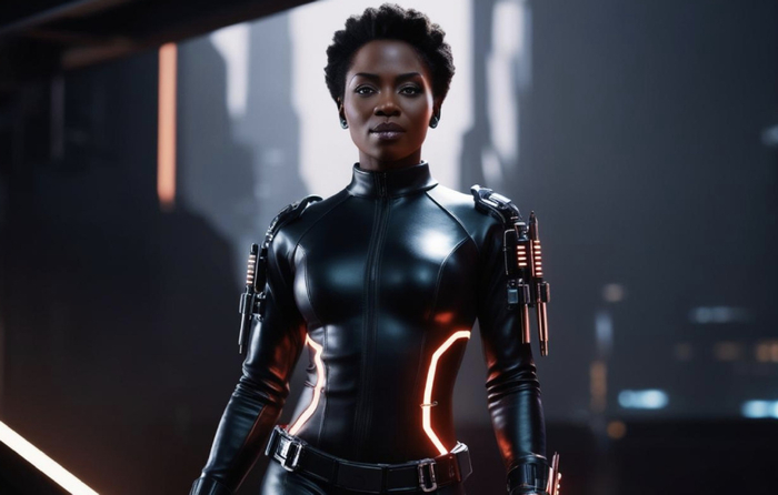 "产生一个16:9水平超逼真图像的一个女人戴着一个黑色的庞克服装。 Canon EF35mm、f1。8、摄影高上详细、超现实的、高清,人类发展报告》,8K,现实生活中。"