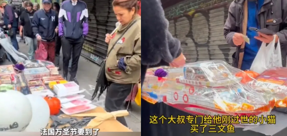 今年万圣节,一位同胞在法国街头摆摊卖殡葬用品。