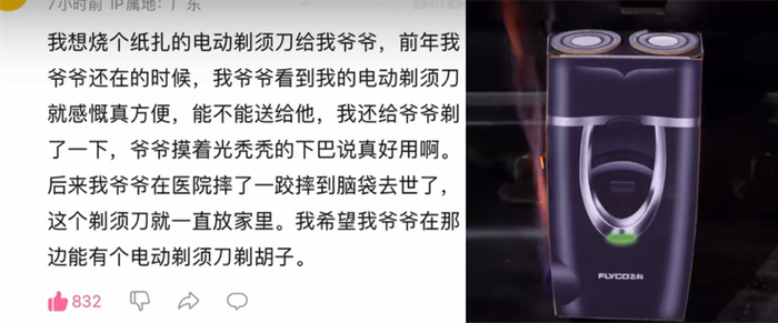 可新买来的剃须刀还没送出去爷爷就去世了,我希望爷爷在那边能有个电动剃须刀剃胡子。”