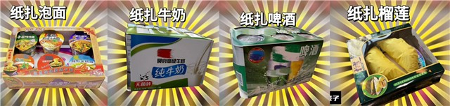 如果这些都不爱,那还有纸扎泡面,纸扎牛奶,纸扎啤酒,纸扎榴莲。