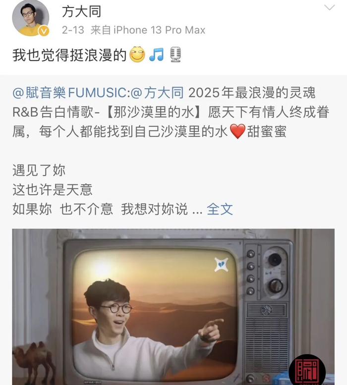拼到生命最后一刻,朱媛媛演戏如此,创作音乐作品的方大同也是这么做的,在去世前8天,他推出了新歌MV《那沙漠里的水》,并转发了该视频。