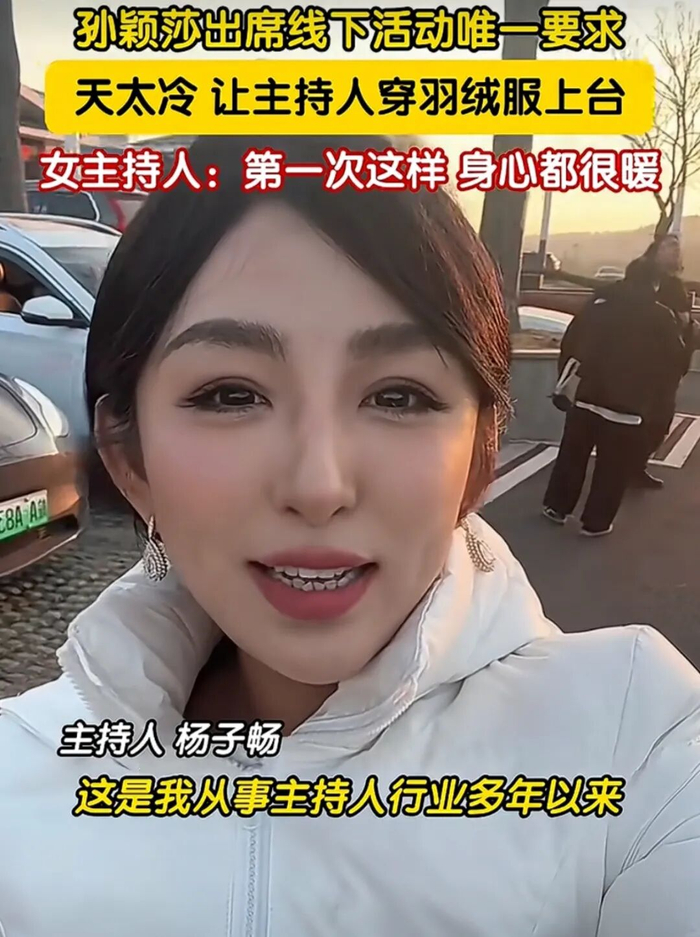 因天气太冷,孙颖莎与活动方沟通“希望主持人能穿上羽绒服”。