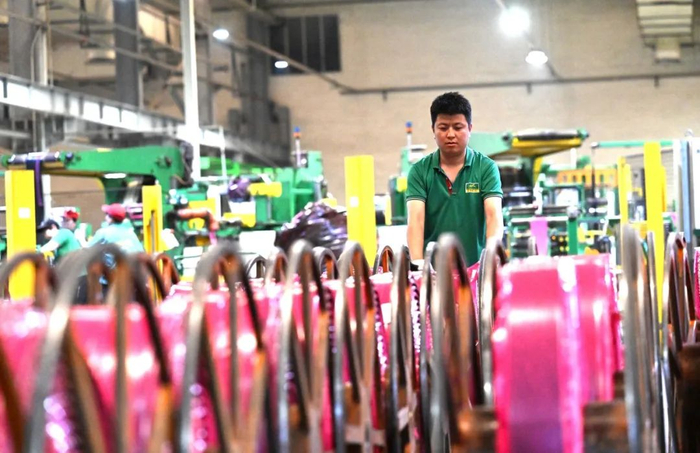 △工人在山东金富橡胶科技有限公司轮胎生产车间忙碌。