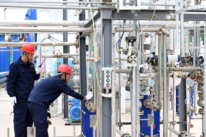 △在位于日照市岚山区的山东蓝昆氢能源科技有限公司,工作人员在进行设备巡检。