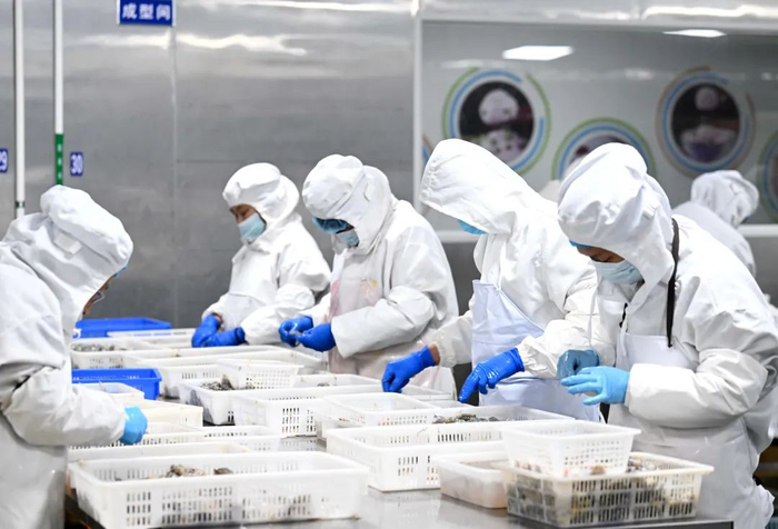 △在位于东港区的涛雒镇拓洋渔业专业合作社,工人们正将清洗分割后的海产品快速包装。无止镜