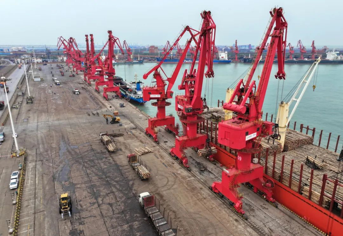 △在日照港岚山港区,装载木材的货轮正停泊作业。