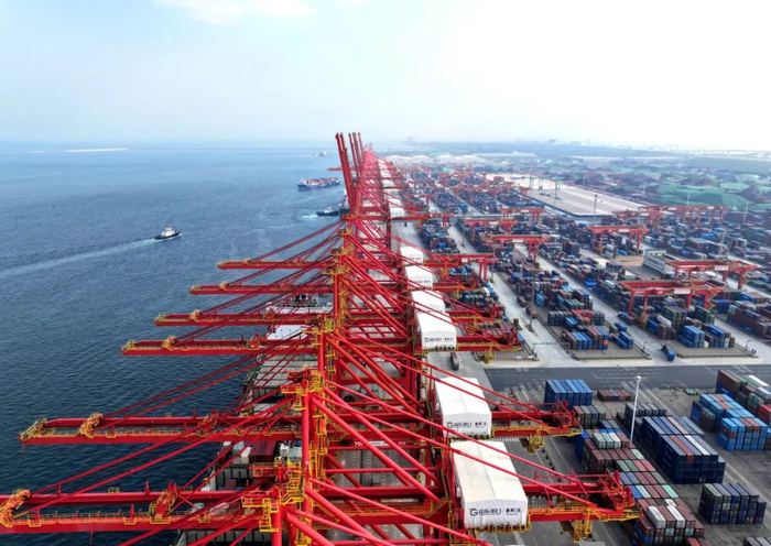 5月的黄海碧波荡漾,山东日照226公里黄金海岸线上,万吨巨轮穿梭如织,顺岸全自动化集装箱码头如钢铁巨龙盘踞,海天之间鸥鸟翔集,与阳光海岸的金沙滩交相辉映,绘就一幅活力画卷。