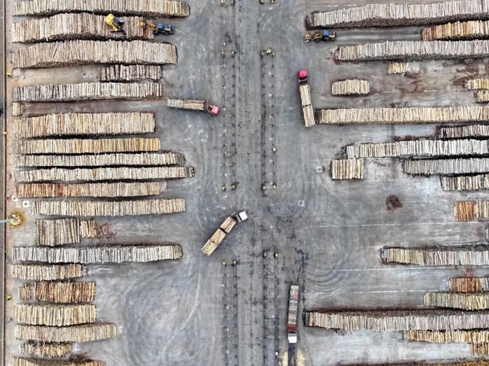 △日照港岚山港区,码头上的车辆正装载木材。无止镜