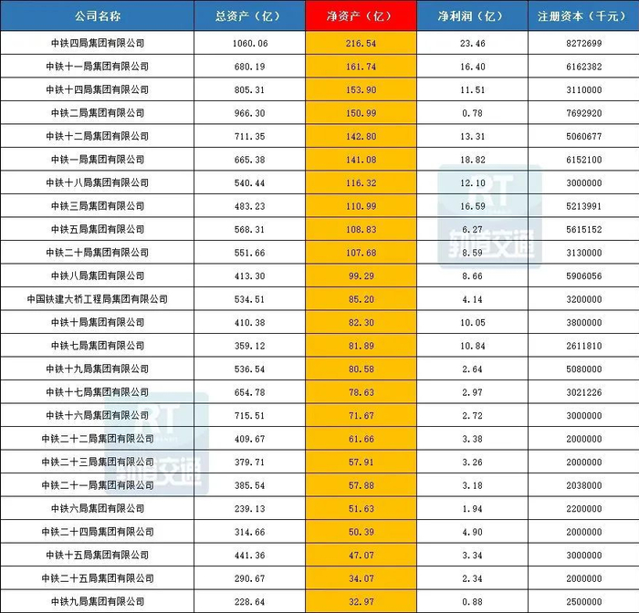 两大公司报告中相继公布了各子公司情况,作为两大建筑央企下面的25个二级号码子公司,中铁1到25局,也都实力非常强劲,RT轨道交通小编摘取2022年中铁1到25局数据,分别从总资产、净资产、净利润三个方面进行对比,到底哪个实力更胜一筹?