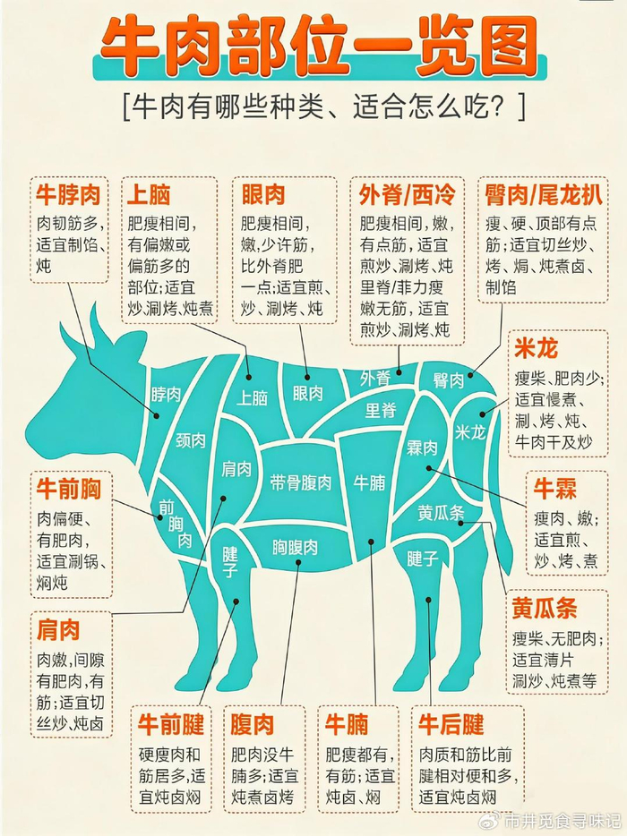 总结下来,买牛肉不用被五花八门的部位名搞晕,认准这5个黄金部位,按做法对号入座,就能轻松买到合适的肉,保准不踩坑、不浪费钱,把每一口牛肉都吃出最佳口感~