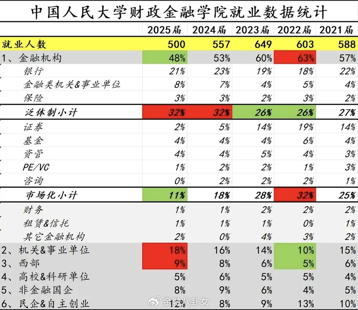 不久前,一份人大财金2025届毕业生去向在金融圈爆红,选择去券商的已经降到了2%,在2022届的时候,券商的比例还有19%,现在直接变成十分之一了。对应地,去银行的比例就很稳,五年以来都在20%上下。