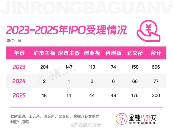 根据券商中国记者统计,全年沪深北三地交易所新增受理IPO企业合计300家,相比2024年的受理数量增近3倍,只不过还没追上2023年的水平。