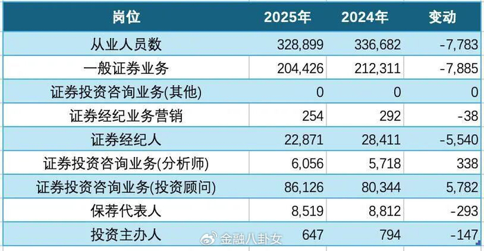 整个券商也在缩减,2025年证券行业从业人员减少7783人,总规模回落至32.8万人。其中,一般证券业务减少了7885人,经纪人减少了5540人,保荐代表人总数8519名,也比年初的8812名减少293人。只有投顾和分析师,分别增加了5782和338人。