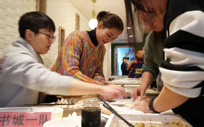 ▲图为河南信阳市新华书店的工作人员,正在书店内包饺子如果以结果来倒推商业动机,这样的破圈实验,无疑是成功的。