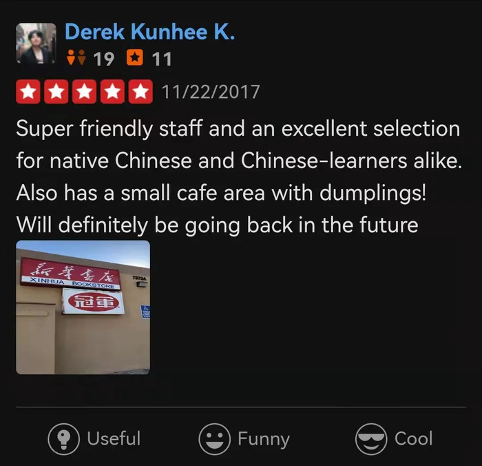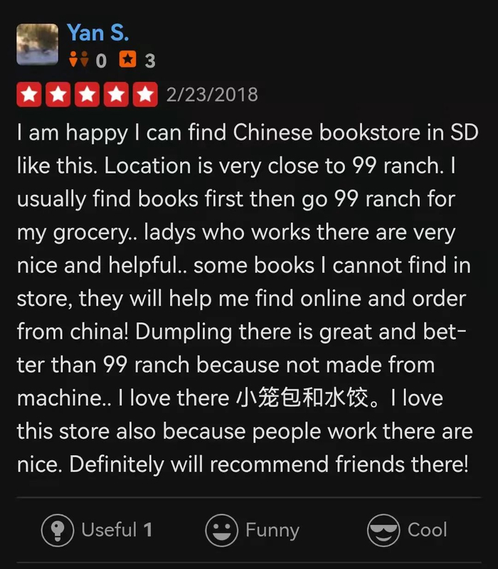 在海外最大的点评网站Yelp上,关于新华书店的好评,正与它们销售的手工水饺一样稳健增长,假以时日,绕赤道一圈不会有太大阻力。