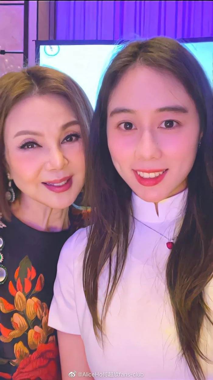这头参加品酒会,碰见赌王家的四房小女儿何超欣,亲切地跟小辈合影。