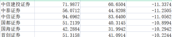 降幅位于10%~20%之间的15家分别是:首创证券、东方证券、东莞证券、财通证券、中信建投、长江证券、东吴证券、南京证券、中信证券、华宝证券、华安证券、太平洋、粤开证券、第一创业、华西证券。