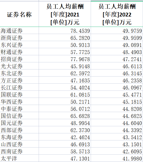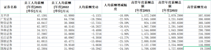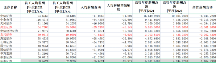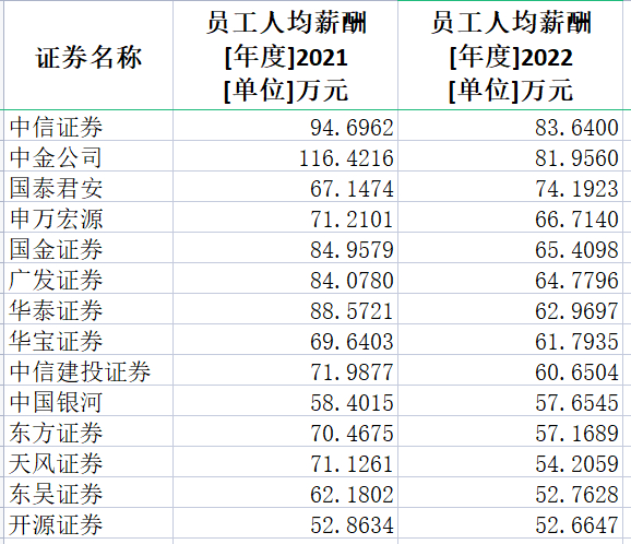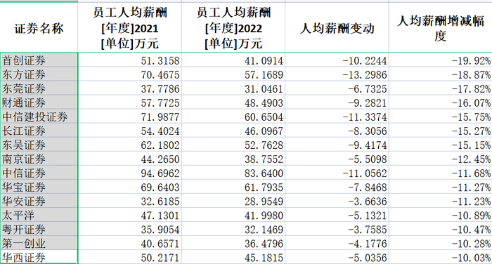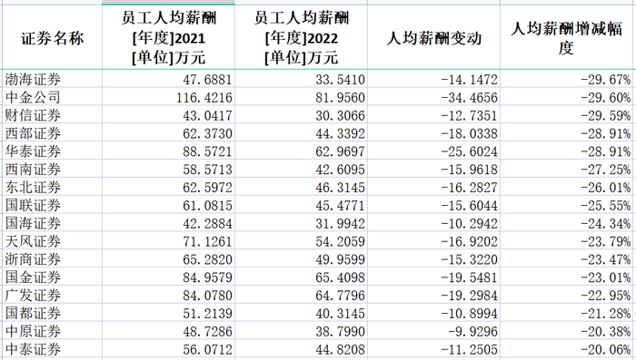 渤海证券、中金公司、财信证券、西部证券、华泰证券、西南证券、东北证券、国联证券、国海证券、天风证券、浙商证券、国金证券、广发证券、国都证券、中原证券、中泰证券降幅则超过20%。这其中只有中原证券因基数低,降薪绝对金额少于10万元。