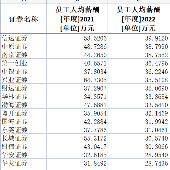薪酬位于30万+水平的共有14家。华安证券和华龙证券人均年薪垫底,分别为28.95万元和28.74万元。