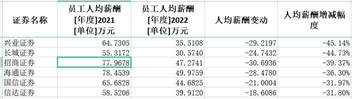 其中,兴业证券降幅最大。兴业证券2021年人均年薪为64.73万元,2022年降至35.51万元,降幅高达45.14%。长城证券2021年人均年薪为55.32万元,2022年降至30.57万元,降幅也达到44.73%。招商证券、海通证券、国信证券、信达证券下降幅度也超过30%。