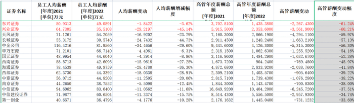需要指出的是,上述高管薪酬总额降幅较大的券商员工薪酬也出现了不同程度下降,但降幅远小于高管薪酬总额。如东兴证券员工人均年薪仅仅从50.93万元小幅下滑至49.09万元,降幅为1.84%,说明一些券商的普通员工对行业降薪的整体感受或会淡一些。