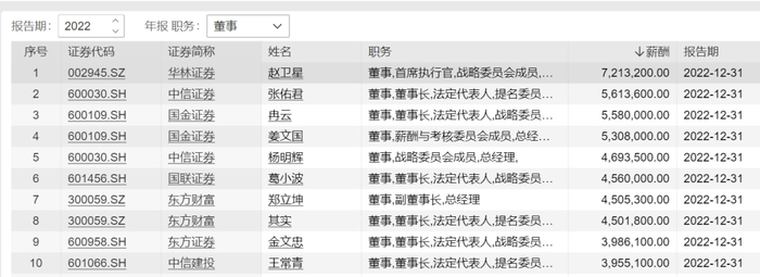 华林证券首席执行官赵卫星以721.32万元年薪位列行业第一。