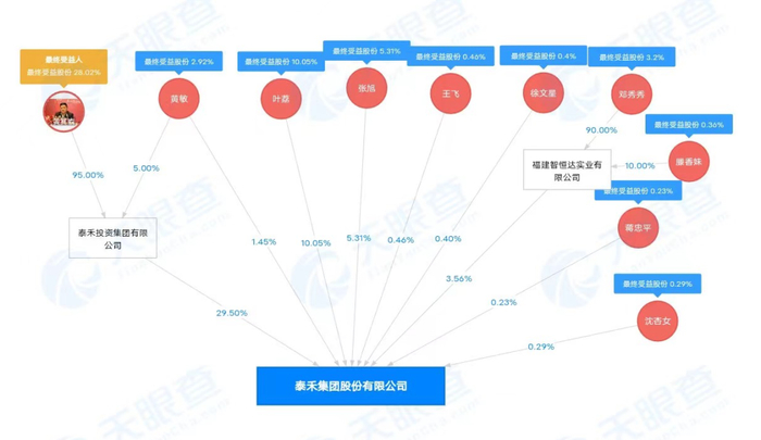 天眼查显示,在上市公司泰禾集团中,叶荔是第二大股东,最终受益股份为10.05%,同时也是泰禾投资的一致行动人。而泰禾投资是上市公司的大股东,由黄其森持股95%。