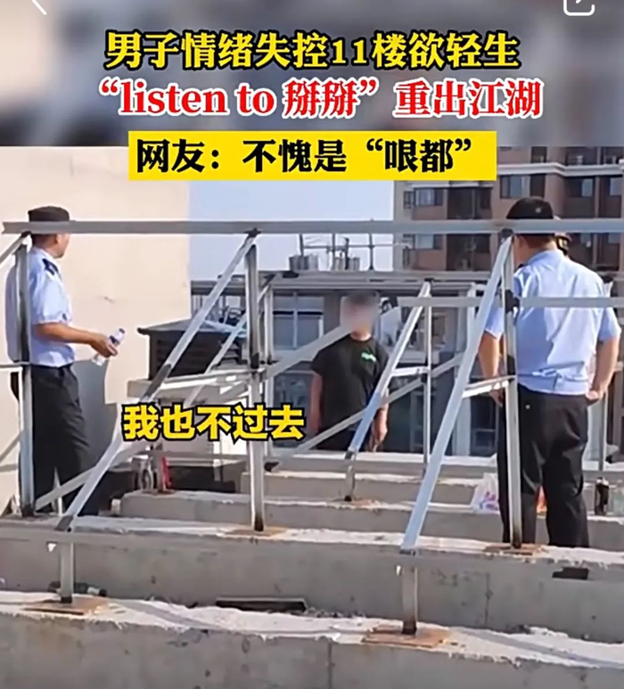 脱口秀演员周奇墨有个著名的段子,说警察劝想跳楼的男孩,过程中爆梗频出,最后直接:listen to baibai。