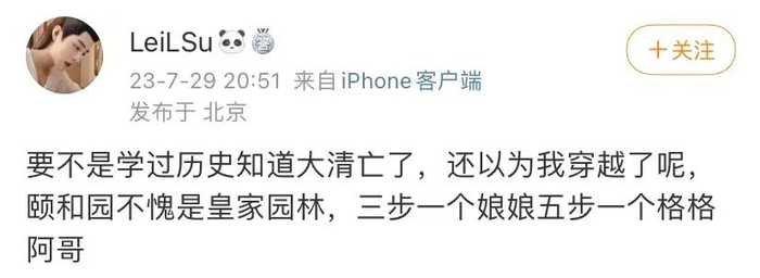 “随便去一个网红店喝下午茶就得一百起步,造景还极有可能是来自某多多的廉价ins风。但在颐和园花上几十块喝个下午茶,就能喝出结局跃升感。”